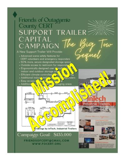 The new trailer has been ordered and is scheduled for delivery during the third quarter of 2024. On behalf of the Friends of CERT board and all the members of the Outagamie County CERT team, we would like to thank over 50 local groups and individuals who have donated to this cause. Your donation will provide CERT with the opportunity to continue to serve our community.