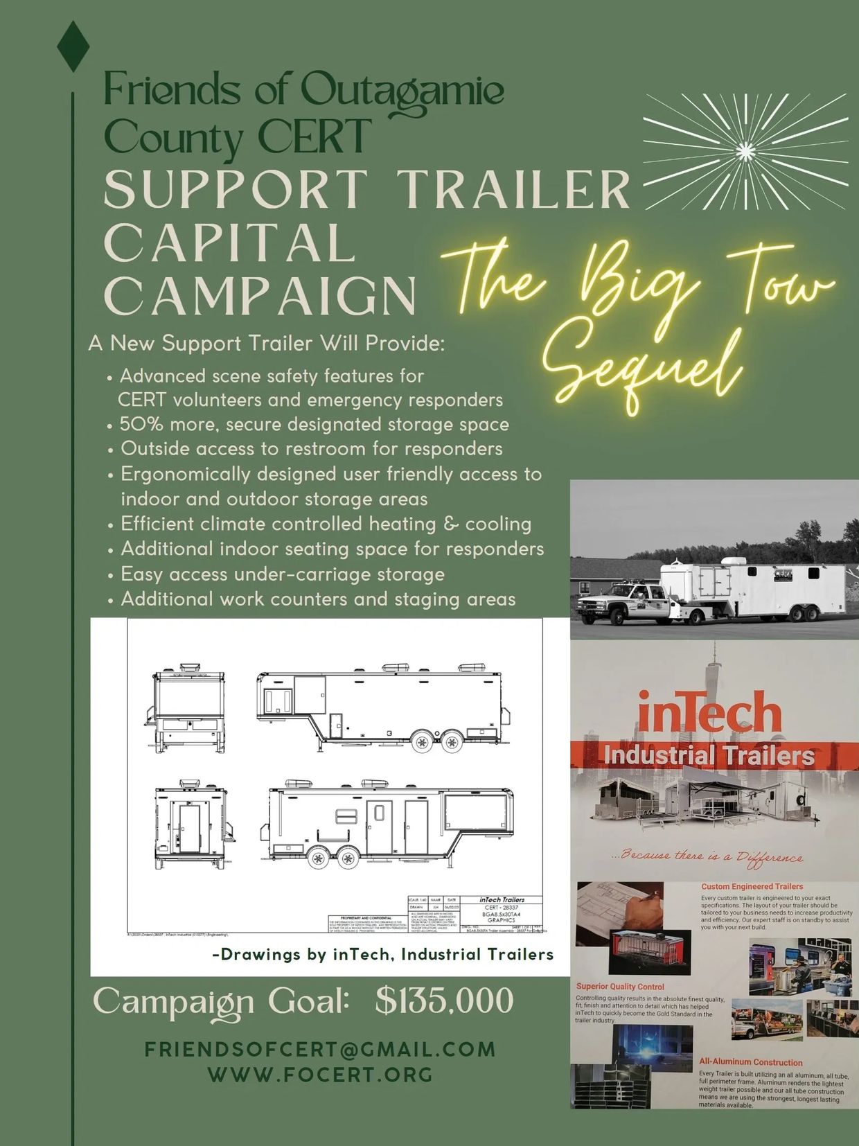 On June 20, 2023, FOCERT kicked off a Capital Campaign to raise $135,000 for the purchase of a new response trailer to enhance the safety of our volunteers and the first responders we support. Our current trailer was donated to the group by the Appleton Fire Department. Although the vehicle looks great, the mechanical components have seen their age and were not designed for our functionality creating some safety and operational challenges. Our goal is to purchase a new response trailer, allowing for a safer and more consistent response. Partnered with our new Ford F-350 tow vehicle, safety, and operations will be significantly enhanced.